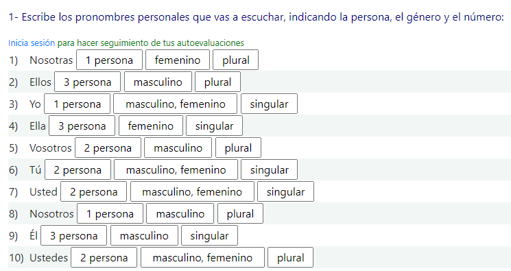 1- Escribe los pronombres personales que vas a escuchar, indicando la persona, el género y el número: